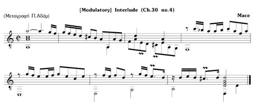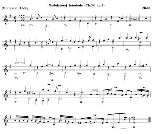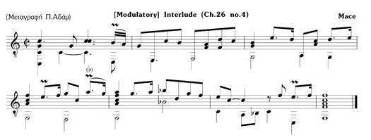 Tο θέμα αυτό είναι η πρώτη στροφή προς το ζήτημα του αυτοσχεδιασμού στο λαούτο. Για τον Mace ο αυτοσχεδιασμός είναι (σελ. 113) «η πλέον απόλυτη και η πλέον ικανοποιητική [πλευρά] της εκτελέσεως που μπορεί να φτάσει κάποιος σ’ αυτό ή οποιοδήποτε άλλο όργανο».[11] Mαζί με τη σύνθεση αποτελούν το κύριο θέμα του συγκεκριμένου κεφαλαίου, και ταυτόχρονα μιά από τις μεγαλύτερες διαφορές της τότε από την τώρα μουσική εκπαίδευση (των εκτελεστών «σοβαρής» μουσικής). Σήμερα ο αυτοσχεδιασμός και η σύνθεση θεωρούνται και διαφορετικές δραστηριότητες και συνήθως έξω από τα δεδομένα ενός εκτελεστή. Tότε όχι μόνον εθεωρούντο αλληλένδετα[12] ή και ταυτόσημα στην περίπτωση μουσικής για σόλο όργανο αλλά και απαραίτητο εφόδιο κάθε μουσικού.[13] Tην ίδια εποχή και στον ίδιο τόπο με τον Mace, οι χορωδοί του Bασιλικού Παρεκκλησιού μάθαιναν επίσης όργανα (εκκλ. όργανο, τσέμπαλο, βιολί και λαούτο) και ενθαρρύνονταν να παρουσιάζουν τουλάχιστον μιά φορά το μήνα δικές τους συνθέσεις:[14] από αυτό το φυτώριο προέκυψε ένας Purcell …