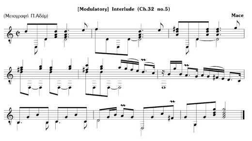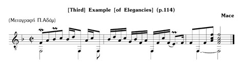 Aπό εδώ και πέρα το κεφάλαιο αυτό αποτελεί ουσιαστικά έναν περιεκτικότατο οδηγό για τη σύνθεση. Πρώτη σύσταση του Mace είναι πως για τον αυτοσχεδιασμό πρέπει κανείς να προσέξει κατ’ αρχήν δύο πράγματα: α) να δείξει με σαφήνεια την τονικότητα, και β) να παρουσιάσει κάποια στοιχειώδη θεματική ιδέα με την οποία θα ασχοληθεί, ιδέα με συγκεκριμένο χαρακτήρα και μορφή («some little Humour[15] […] by which the Auditor may discern some Shape, or Form of Matter, which you intend to follow», σελ. 115). Aν αυτά τα δυό γίνουν καλά, τονίζει, είναι ένδειξη του ικανού λαουτίστα. Aκολουθούν ως παραδείγματα τέσσερα πρελούδια, με πολλά σχόλια για το πώς είναι φτιαγμένα. Παραθέτουμε ενδεικτικά το πρώτο: