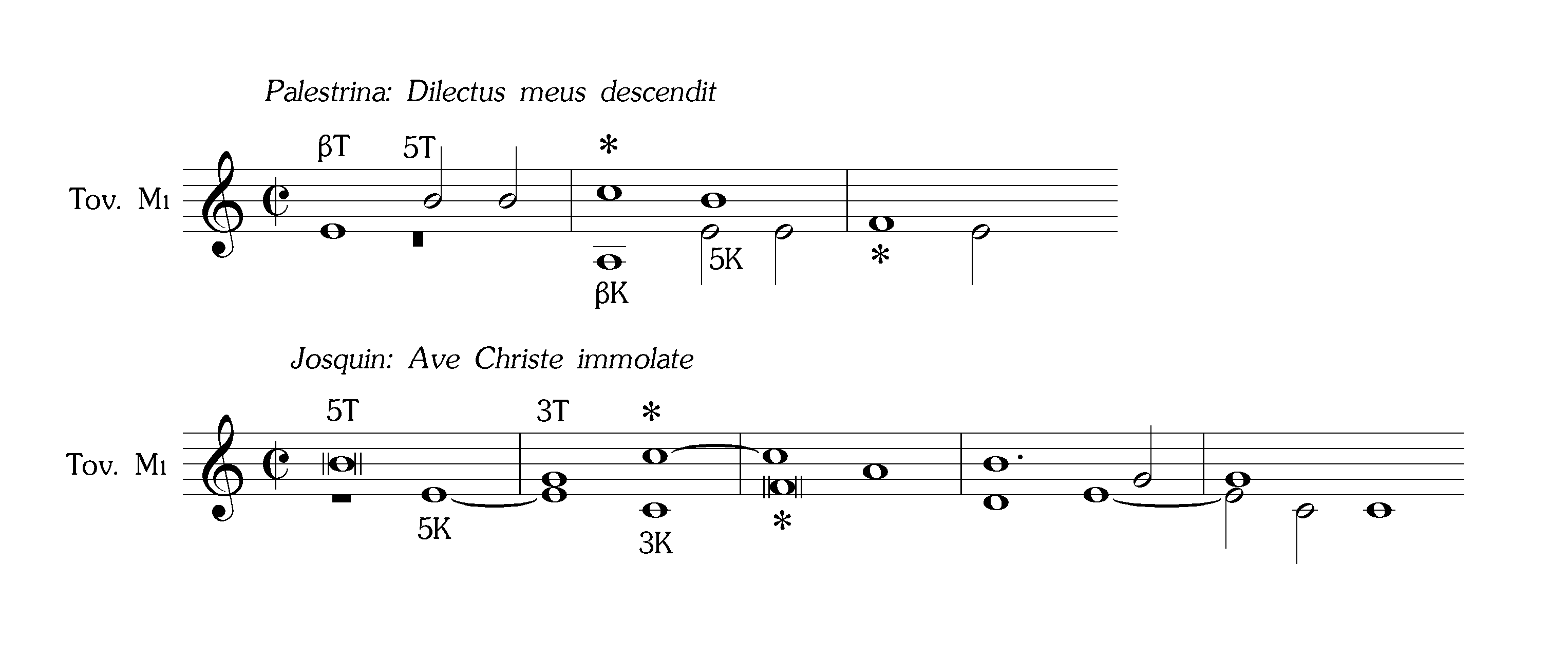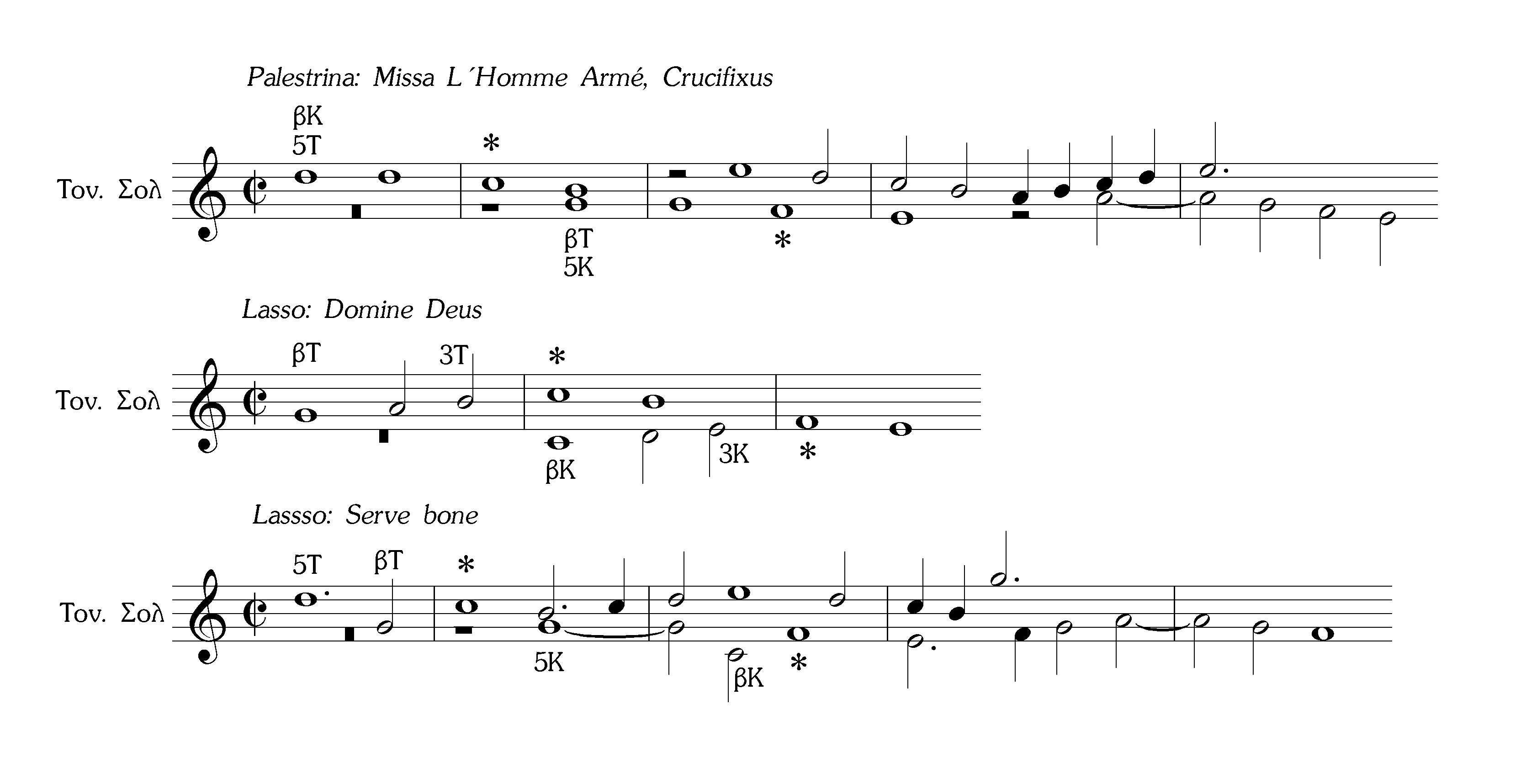 33. Xωρίς να αποκλείεται εντελώς, π.χ. Palestrina: Missa brevis, Kyrie ή Tallis: Absterge Domine. O Zarlino πάντως (ό.π., σελ. 57-58) το θεωρεί κακό γιατί οι είσοδοι που θα απέχουν ενάτη ή εβδόμη δεν ταιριάζουν και η μία “μπορεί να αρχίζει εκτός τρόπου” – το δέχεται μόνο αν προκύπτει από κανόνα που δημιουργεί τη συγκεκριμένη σχέση επιπέδων.