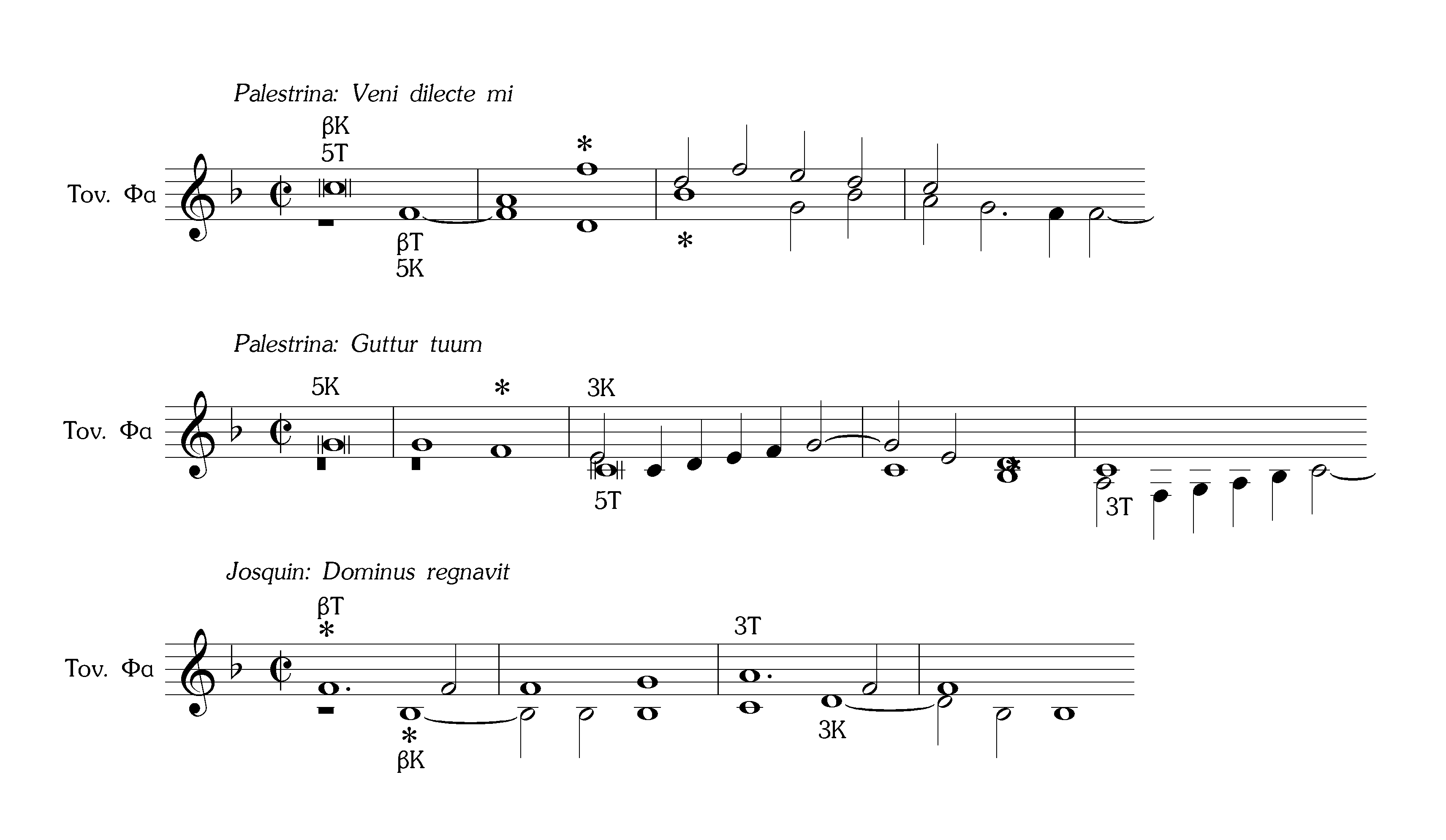 29. Π.χ. Victoria: Missa Laetatus, Christe eleison (S-S-S), Lasso: Veni in hortum meum (σειρά εισόδων T-T-A-B-S), Palestrina: Domine praevenisti eum (σειρά εισόδων S-S-A-T-B).