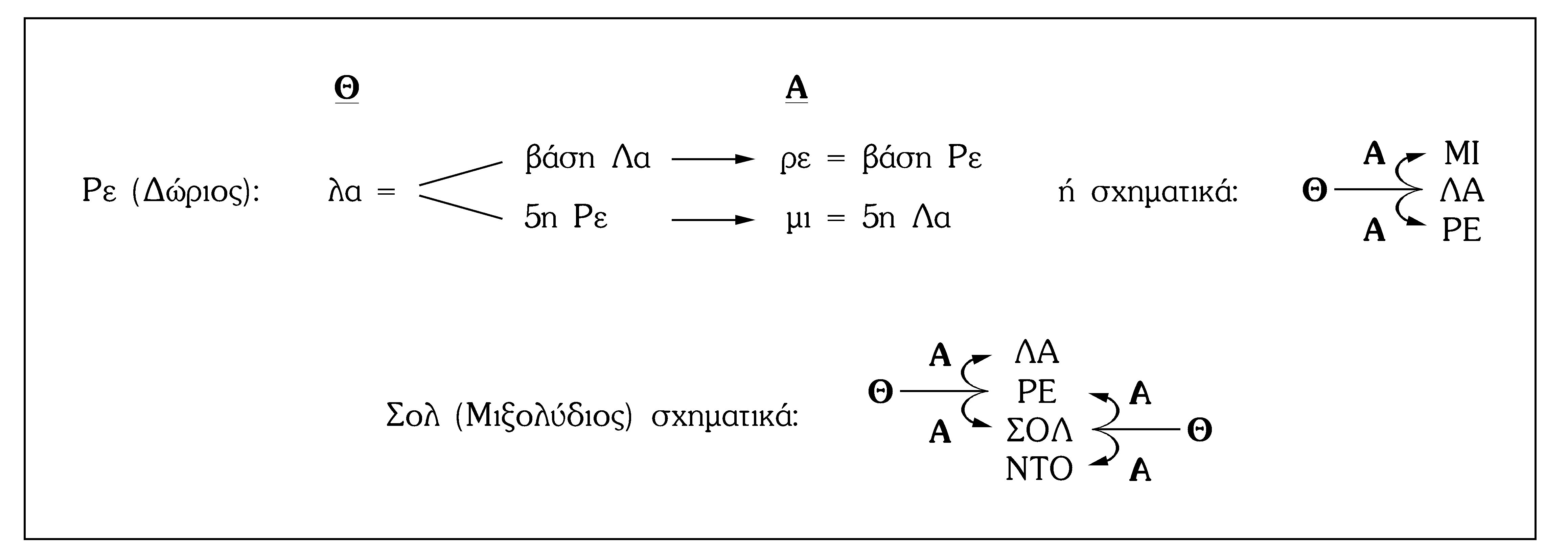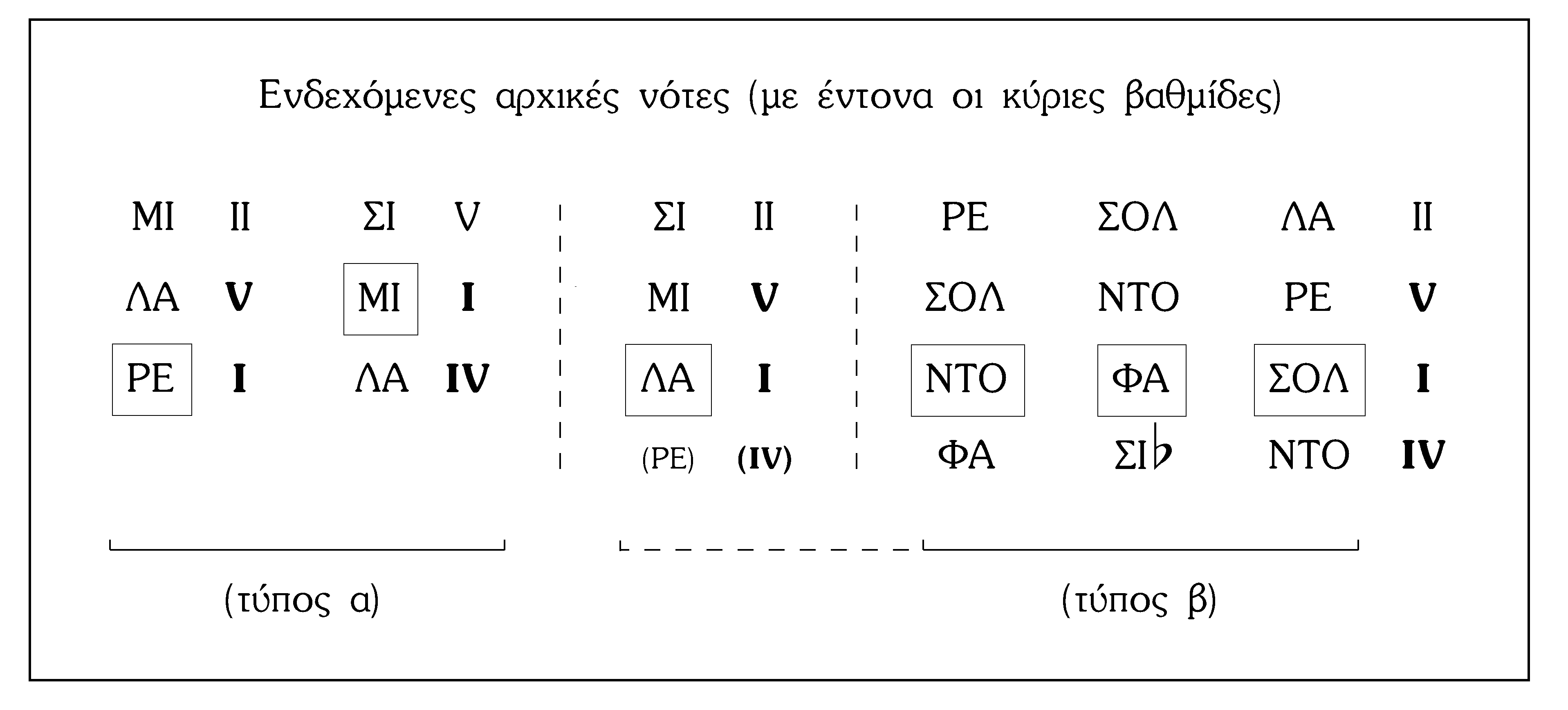 32. Mεγαλύτερη σημασία έχει κατά περίπτωση η πάνω ή η κάτω νότα ενός ημιτονίου, ανάλογα με το ποιά ανήκει σε κύρια συγχορδία του τρόπου – π.χ. στον Δώριο σημαντικότερο το ντο ως 3η της Λα, στον Mιξολύδιο σημαντικότερο το σι ως 3η της Σολ.