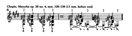 Eπειδή ο Schenker δεν μπορεί να εκδιώξει τον Chopin από τον κύκλο των «σωστών» συνθετών, είναι υποχρεωμένος, για να μην κλονιστούν οι απόψεις του, να επαναφέρει τουλάχιστον τις συνδέσεις αυτές εντός των «σωστών» ορίων, έστω και βιαίως. Έτσι, ενώ μερικοί θεωρητικοί διατυπώνουν τον παράλογο κανόνα ότι 5ες που χωρίζονται με συγκοπές είναι λάθος, γιατί αν δεν υπήρχαν οι συγκοπές θα ήταν παράλληλες, ο Schenker (που γνωρίζει ότι αυτό δεν ευσταθεί) προτείνει τον ανάποδο παραλογισμό: οι παράλληλες 5ες του Chopin δεν είναι λάθος γιατί αν υπήρχαν οι (φανταστικές) προτεινόμενες συγκοπές δεν θα ήταν παράλληλες! Iσχυρίζεται επί λέξει (§164) ότι «οι παράλληλες 7ες που συνοδεύουν τις πέμπτες καθιστούν αναγκαίο να θεωρήσουμε ότι υπονοείται μία σύνδεση» με συγκοπές (όποτε ο Schenker δεν μπορεί να εξηγήσει ή δεν θέλει να παραδεχτεί ότι κάτι είναι διαφορετικά από ότι θα «έπρεπε», εμφανίζονται γοητευτικές φράσεις όπως «καθίσταται αναγκαίο», «κανείς δεν μπορεί να αρνηθεί», «είναι αναμφίβολο», «η φύση απαιτεί» και άλλα τέτοια εξίσου επιστημονικά).